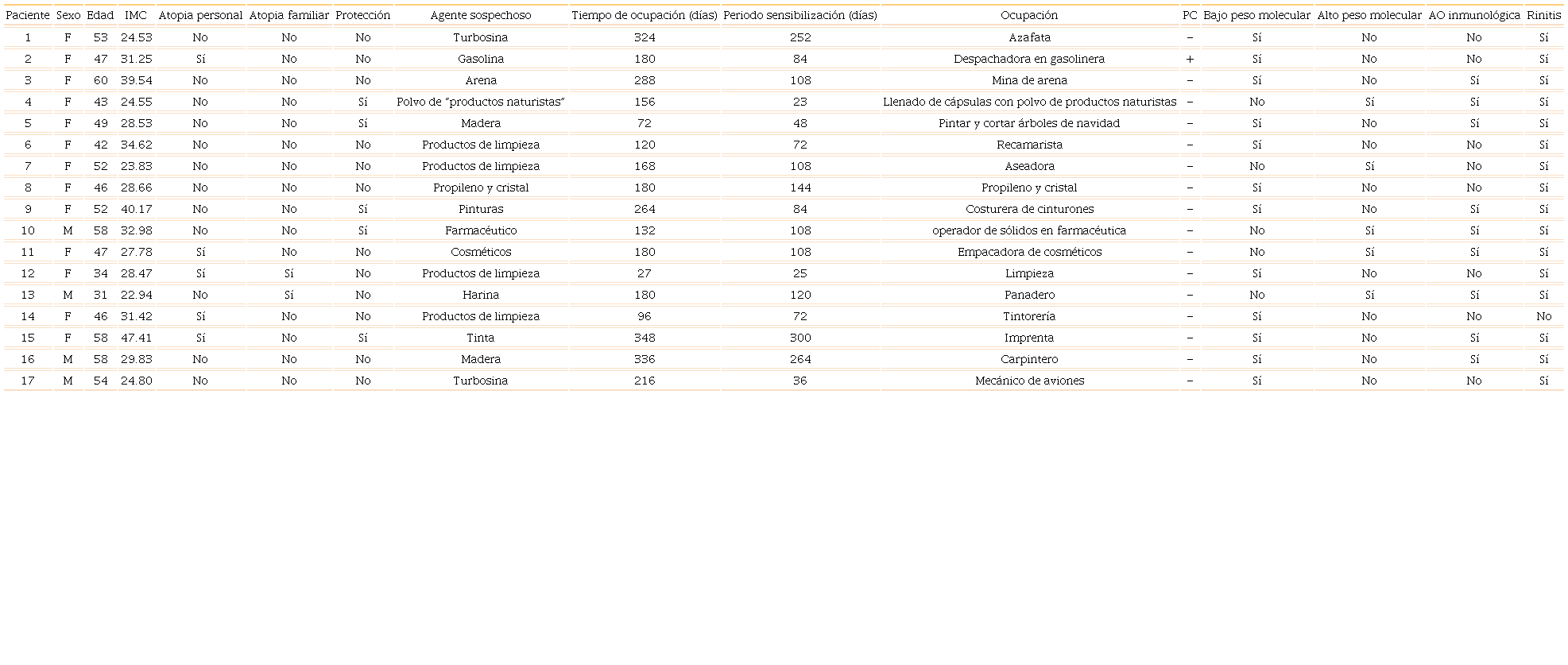 Cases report: A series of 17 patients with an asthma diagnosis and occupational exposure to dust, vapors, or fumes is reported; occupational asthma was determined by the Allergy and Clinical Immunology Service at Centro Médico Nacional Siglo XXI.