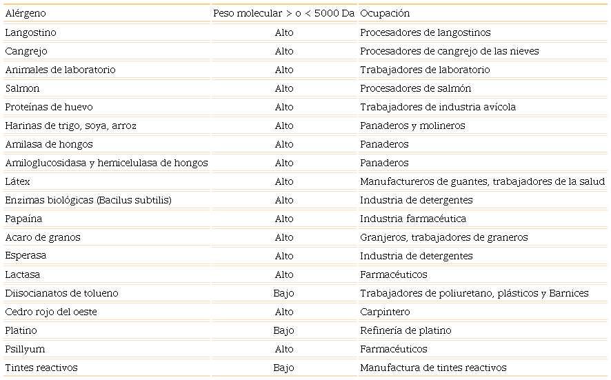 Se han descrito más de 350 agentes relacionados con AO (Cuadro 2). Los agentes de alto peso molecular (HMW) tienen mecanismo dependiente de IgE y el mecanismo es no dependiente de IgE en la mayoría de los agentes de bajo peso molecular (LMW), excepto en las sales de platino, ácidos anhídridos y diisocianatos. 8,9 Los agentes de LMW causan AO hasta en 53.8 a 93 % de los casos. 10