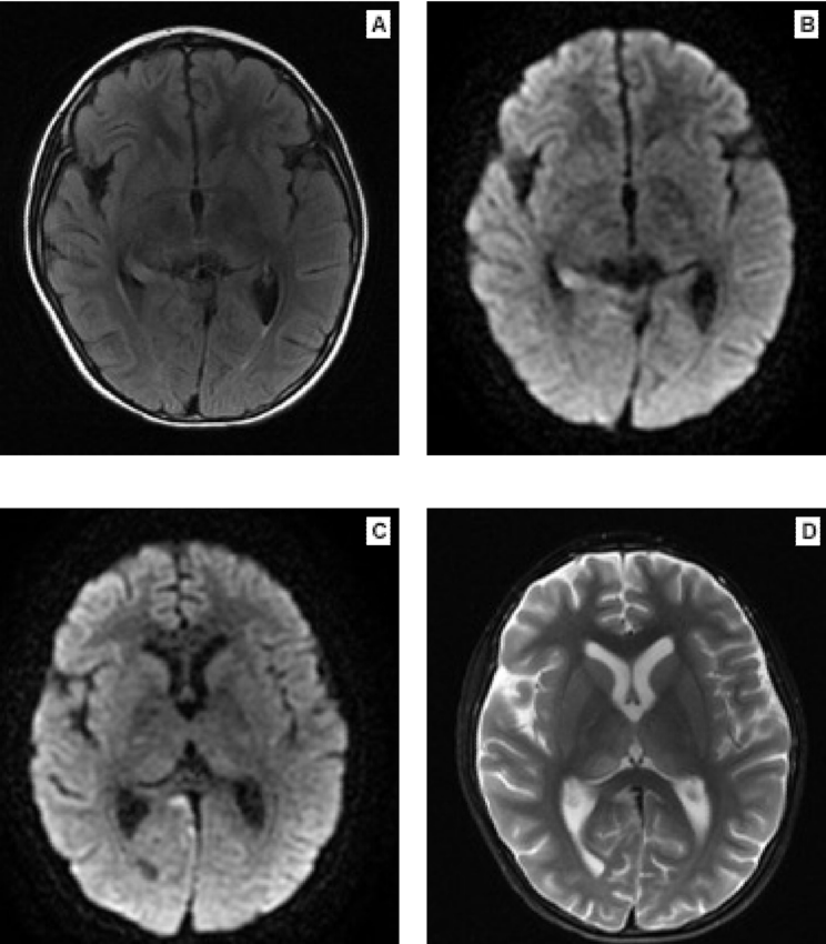 La evolución fue tórpida a las 48 horas, con deterioro neurológico progresivo; el lenguaje se tornó incoherente, ecolálico y el estado de conciencia fluctuaba de agitación severa a somnolencia y estupor. Los movimientos de los ojos eran anormales. El paciente fue traslado a la unidad de cuidados intensivos pediátricos, donde se registró hipertensión arterial sistémica, hipotiroidismo e hiponatremia asociada a síndrome de secreción inadecuada de hormona antidiurética y crisis convulsivas focales no provocadas. El estado neurológico evolucionó a mínima conciencia, síndrome distónico y trastorno deglutorio (gastrostomía).