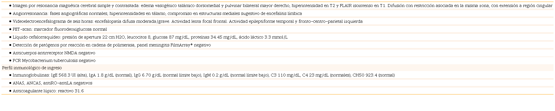 No obstante, el abordaje neurológico de la encefalitis autoinmune engloba criterios clínicos, de líquido cefalorraquídeo, imágenes, cambios en el electroencefalograma, como presencia de "cepillo-delta" extremo por antirreceptor de N-metil-D-as-partato,8,9 por lo que se hace necesario buscar otras causas probables como las de origen inmunológico que puedan esclarecer la evolución clínica.