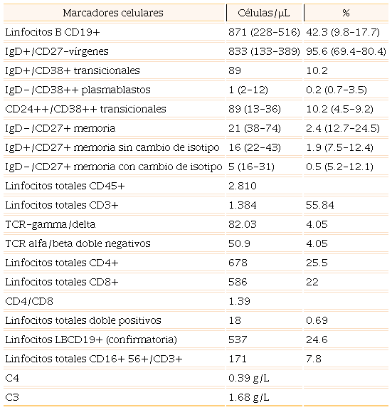 El perfil inmunológico indicó IgG baja (3.5), linfocitos LBCD19+ ausentes (absolutos y porcentuales), linfocitos T CD3 normales (1.953), NK normales (154), CD8 normales (1.001), CD4 normales (479-39.8 %), CD4/CD8 bajos (0.76). La prueba de citomegalovirus indicó IgG de 204 (+) y la del virus de Epstein-Barr, IgG de 4.75 (+) e IgM de 0.03. En las subclases de IgG se encontró G1 y G2 altas (16.84 y 8.73 g/L), así como G3 y G4 normales (0.8 y 0.73). También se registró linfopenia leve sostenida (830 células/μL) y leucocitos totales normales (5600).