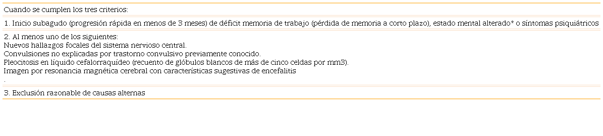 En 2007, Dalmau5 describió un caso de encefalopatía autoinmune causada por anticuerpos antirreceptor N-metil-D-aspartato en un paciente con teratoma de ovario. Este hallazgo desató un cambio radical en el abordaje de este trastorno y significó la apertura al estudio de otros cuadros de encefalitis y su asociación con síndromes paraneoplásicos. La encefalopatía autoinmune se asocia a producción de anticuerpos contra diferentes receptores del sistema nervioso central; su ausencia no excluye la posibilidad de alteración inmunológica y una prueba positiva no siempre implica un diagnóstico específico.2,4,6 Los criterios publicados en 2016 por Francesc Graus se exponen en el Cuadro 3.7