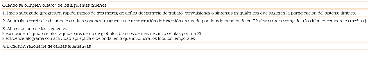 La encefalopatía límbica se caracteriza por cuadro súbito asociado a confusión, déficit de memoria, cambios de humor y, a menudo, convulsiones. El desarrollo subagudo de pérdida de memoria a corto plazo se considera el sello distintivo de este trastorno;7 los criterios diagnósticos se describen en el Cuadro 4 y los hallazgos por imagen de resonancia magnética cerebral se aprecian en la Figura 1.