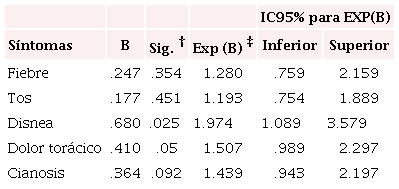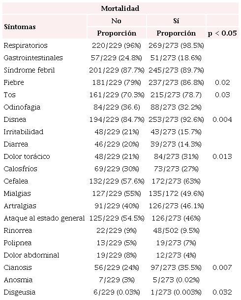 Los principales síntomas en pacientes fallecidos por COVID-19 fueron: fiebre, tos, disnea, dolor torácico y cianosis, con significación estadística (Cuadro 1). La disnea y el dolor torácico fueron síntomas con significación estadística (Cuadro 2) relacionados con mortalidad.