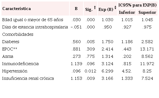 Conclusiones: Este estudio demuestra que los principales factores de riesgo asociados con mortalidad por COVID-19 son: edad igual o mayor de 65 años, estancia hospitalaria prolongada, coexistencia de dos o más enfermedades, diabetes, hipertensión e insuficiencia renal crónica; además de concentraciones elevadas de ferritina, Dimero D y DHL.
