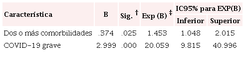 Se observó que cuando un paciente tiene más de dos comorbilidades existe mayor riesgo de mortalidad por COVID-19, con significación estadística. La clasificación de severidad de COVID-19 (grave) mostró ser un factor de riesgo de mortalidad (Cuadro 4).