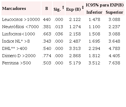 Las concentraciones altas de ferritina (>500), DHL (>400) y Dímero D (>2000) se asociaron con mayor riesgo de mortalidad por COVID-19, con significación estadística (p<0.05). Cuadro 5
