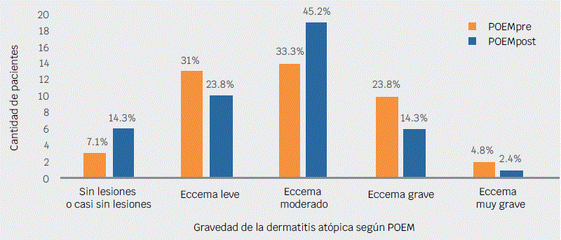 Gravedad de la enfermedad. El puntaje medio del POEM antes de la pandemia (POEMpre) fue de 11.83 (DE 7.34: IC 9.54-14.12), mientras que el actual (POEMpost) de 10.12 (DE 6.53; IC 8.08-12.15), p=0.004 (Figura 1). El puntaje medio del PO-SCORAD antes de la pandemia (PO-SCORADpre) fue de 37.77 (DE 17.32) y el actual (PO-SCORADpost) de 32.49 (DE 17.17), p=0.001 (Figura 2). Los pacientes que refirieron no tener tratamiento actualmente (57.1%) tuvieron un PO-SCO- RAD promedio de 34.26, mientras que quienes continuaron con tratamiento obtuvieron un puntaje promedio de 30.12.
