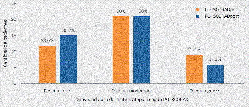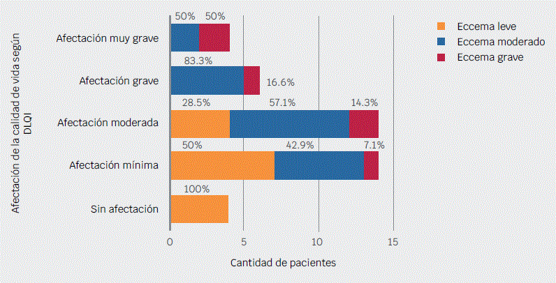 Calidad de vida. La mediana del DLQI fue de 7 puntos. El 33.3% de los pacientes mostró afectación mínima, 33.3% moderada, 14.3% grave, 9.5% muy grave y 9.5% no tuvo ninguna afectación (Figura 3). Se observó correlación entre el PO-SCORADpost y el DLQI (r=0.725; p>0.0001).