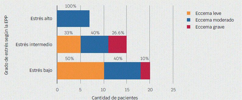 Estrés percibido.La media del puntaje de la escala de estrés percibido fue de 27.38 (DE 7.92). El 47.6% se clasificó con grado de estrés bajo, 35.7% intermedio y 17% alto (Figura 4). La gravedad de la dermatitis atópica no se correlacionó con el estrés percibido (r=0.288; p=0.64).