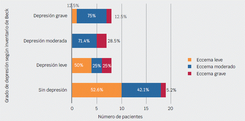Se encontró correlación entre la calidad de vida y la gravedad de la dermatitis atópica. Silverberg y su grupo de trabajo mostraron resultados similares en más de 600 pacientes, observaron que el aumento en la gravedad de la dermatitis atópica, evaluada mediante los cuestionarios PO-SCORAD y POEM se correlaciona con aumento en las puntuaciones del DLQI.22Se ha documentado que los pacientes con dermatitis atópica tienen mayor prevalencia de estrés; sin embargo, en nuestro estudio, aunque se observó una tendencia en los grados de estrés y la gravedad de la dermatitis atópica, no se logró demostrar una asociación estadísticamente significativa, debido al tamaño de muestra. Otros estudios han estimado que la prevalencia de depresión es alta en adultos con dermatitis atópica, así como las tendencias suicidas,23,24 y esta prevalencia tiene una correlación positiva con la gravedad de la enfermedad. Y aunque en nuestra población se observó una prevalencia alta de depresión, en más del 50%, no encontramos asociación con la gravedad del eccema, debido a la coexistencia factores desencadenantes adicionales, como el aislamiento y la pérdida de familiares que ha ocasionado la pandemia por la Covid-19.