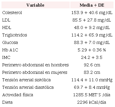 Riesgo cardiovascular. La media de los valores de los estudios de laboratorio y de las medidas antropométricas se muestran en el Cuadro 1. Según el IMC, el 54.5% de los pacientes tenía peso normal y 36.4% sobrepeso. Para la medida del perímetro abdominal, el 63.6% mostró una medición de riesgo. En cuanto a la tensión arterial, el 31.8% tuvo tensión elevada. El 31.8% de los casos mostró tabaquismo activo y todos se categorizaron fumadores leves, según el cálculo del índice tabáquico. El 72.7% reportó consumo de alcohol activo, en su mayoría clasificados bebedores en grado moderado a bebedores en gran riesgo. El 45.4% refirió actividad física moderada. En la valoración de la dieta, el percentil 50 para las kilocalorías consumidas al día fue de 2296 kCal. A través de la escala Globorisk, el 86.4% de los pacientes tuvo <1% de riesgo de eventos cardiovasculares y el resto (13.6%) se mantuvo en 1%, clasificados con riesgo muy bajo.