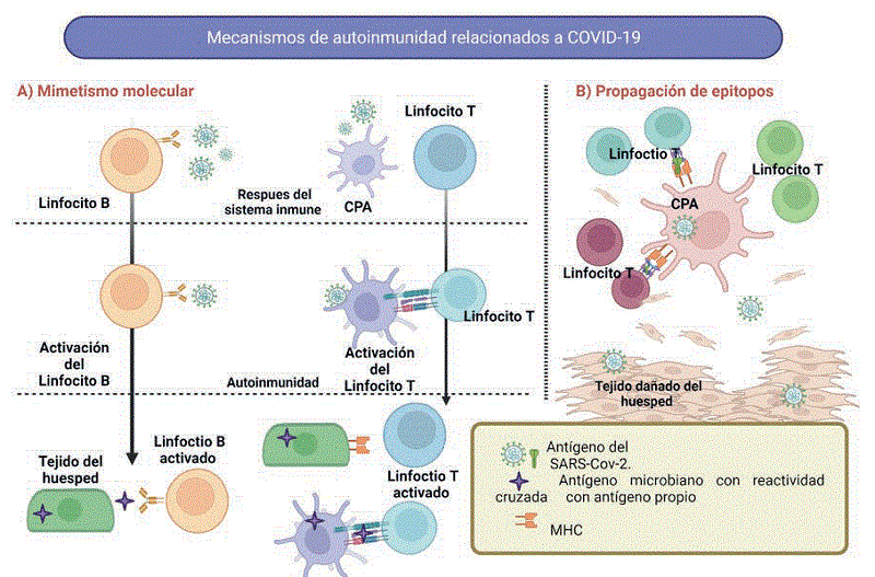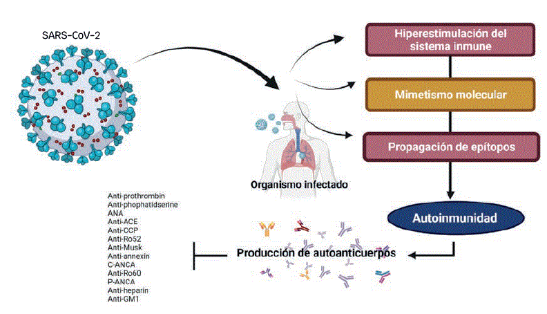 Los mecanismos para adquirir autoinmunidad luego de la infección por SARS-CoV-2 incluyen: “mimetismo molecular” y “activación de espectadores”; es decir, la infección conduce a la activación del antígeno.3,6 La aparición de enfermedades autoinmunitarias pueden originarse por diversos factores, mediante un estado de hiperestimulación del sistema inmunitario, donde los virus representan un factor de riesgo para adquirir autoinmunidad.7