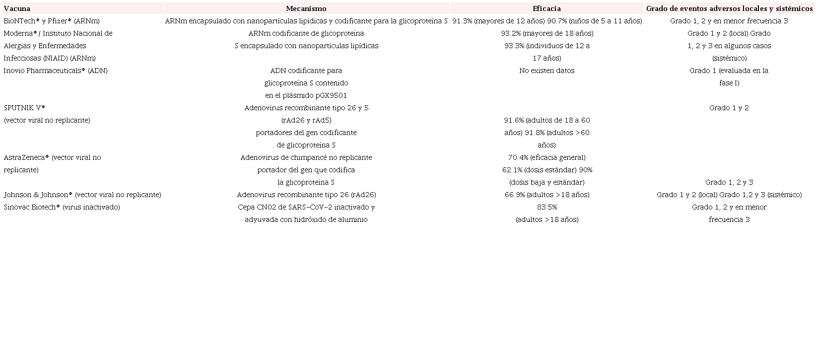 La vacuna Corminaty (Pfizer®/BioNTech®) fue aprobada el 21 de diciembre de 2020; la de Moderna el 6 de enero del 2021 y la de AstraZeneca el 29 de enero de 2021. Las 3 vacunas han mostrado grados de seguridad y eficacia adecuados. Las vacunas Pfizer/BioNTech y Moderna tienen mecanismo de acción similar, utilizan plataformas de ARNm encapsulado en coberturas lipídicas para facilitar su entrada en la célula. Este ARNm transcribe para que la célula traduzca el mensaje para codificar la proteína S, y después de su función se desintegra rápidamente, sin integrarse al ADN humano. La vacuna de AstraZeneca® utiliza plataformas vectoriales, en concreto un adenovirus de chimpancé que vehiculiza el material genético necesario para codificar la proteína S al interior de las células humanas. La eficacia mostrada en los ensayos clínicos es similar: 95 y 94% en las dos vacunas de ARNm, sin diferencias significativas entre los distintos grupos de edad, y entre el 62.1% y 90% de eficacia de AstraZeneca®.36