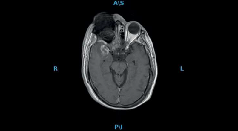 In light of everything said above, thrombosis of the right cavernous sinus and right cavernous syndrome, likely owing to rhino cerebral mucormycosis, was determined to be the presumptive diagnosis. Unaffected was the left eye. The nuclear magnetic resonance of the facial massif revealed mucus sequestration-suggestive soft tissue erosion in the an- terior ethmoid cells, supraorbital, posterior, and sphenoidal areas, as well as bone lysis of the septum in areas I, II, and IV, and middle and lower right turbinate (Figure 2).