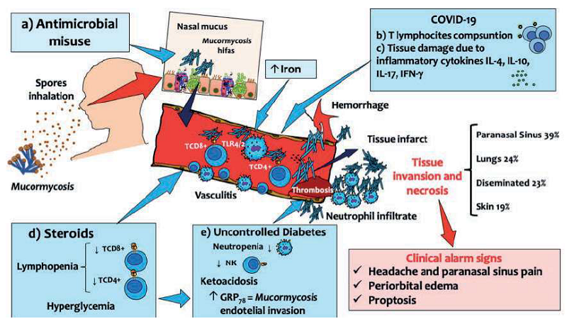 Studies in murine models have demonstrated that diabetic ketoacidosis, in particular, causes hyperglycemia to result in GRP78 (Glucose Receptor Protein 78) overexpression, which has been linked to making it easier for Mucor to infiltrate the vascular endothelium and thereby promoting its dissemination.6 Elevated serum iron is another sign of immunosuppression-related diseases, which is a perfect substrate and growth environment for this fungal infection.7 But at the other hand, COVID-19's inflammatory phase depletes lymphocytes, while long-term high dosages of dexamethasone inhibit the immune system. (Figure 3).