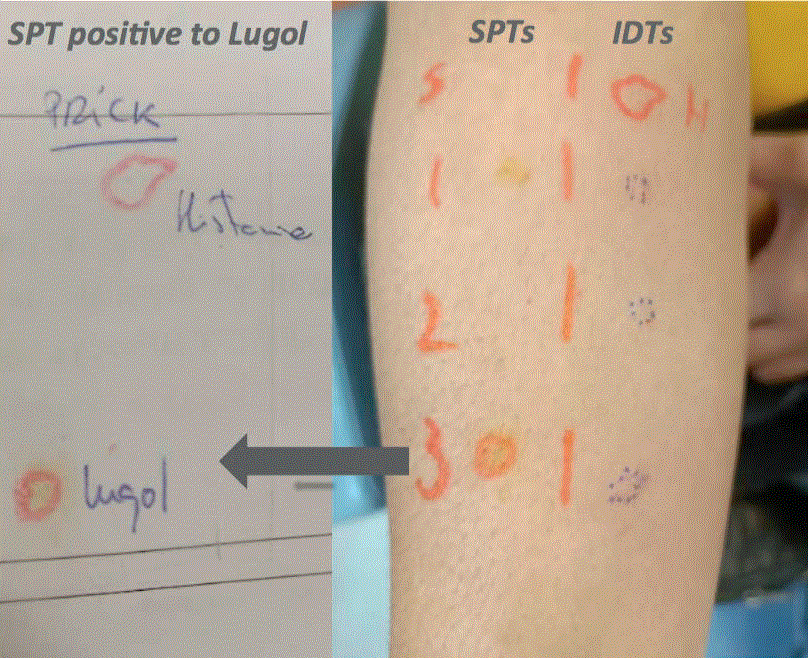 Conlusions: Our report demonstrates a rare case of allergy to Lugol solution with positive SPT and a clinical suggestive reaction, with tolerance to other iodine preparations and potassium iodide.