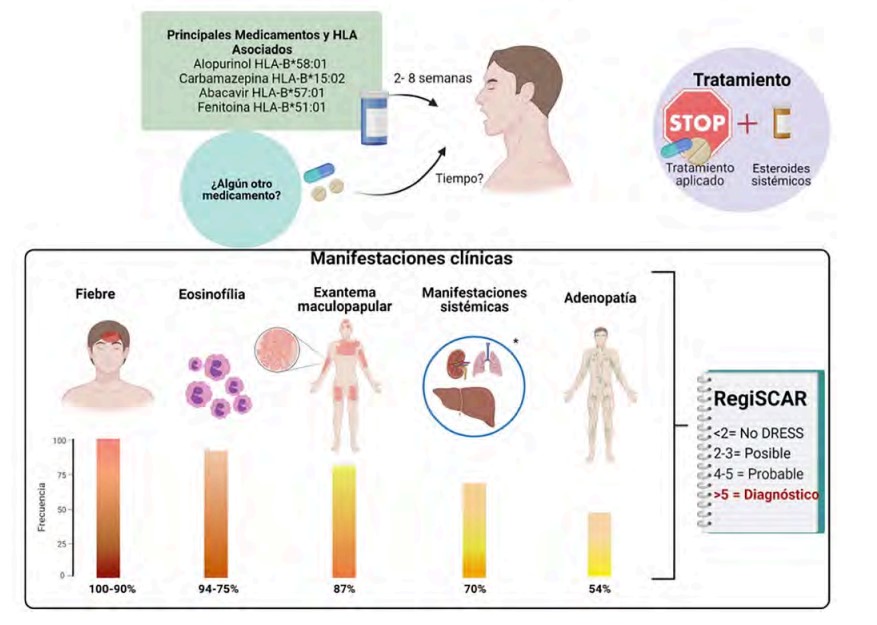 Dentro de las reacciones graves a medicamentos no mediadas por algún mecanismo de hipersensibilidad tipo I se incluye el síndrome de reacción a medicamentos con eosinofilia y síntomas sistémicos, o síndrome de DRESS (Drug Reaction with Eosinophilia and Systemic Symptoms). Esta enfermedad se caracteriza por fiebre, exantema maculopapular, recuento elevado de eosinófilos1 y manifestaciones clínicas multiorgánicas heterogéneas luego de la administración continua del fármaco sensibilizador, en un lapso de dos a ocho semanas.2Figura 1
