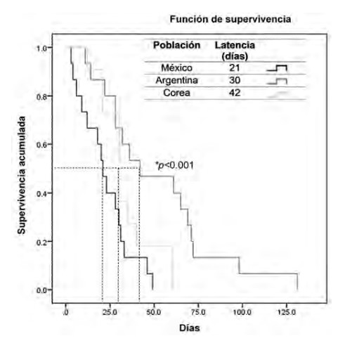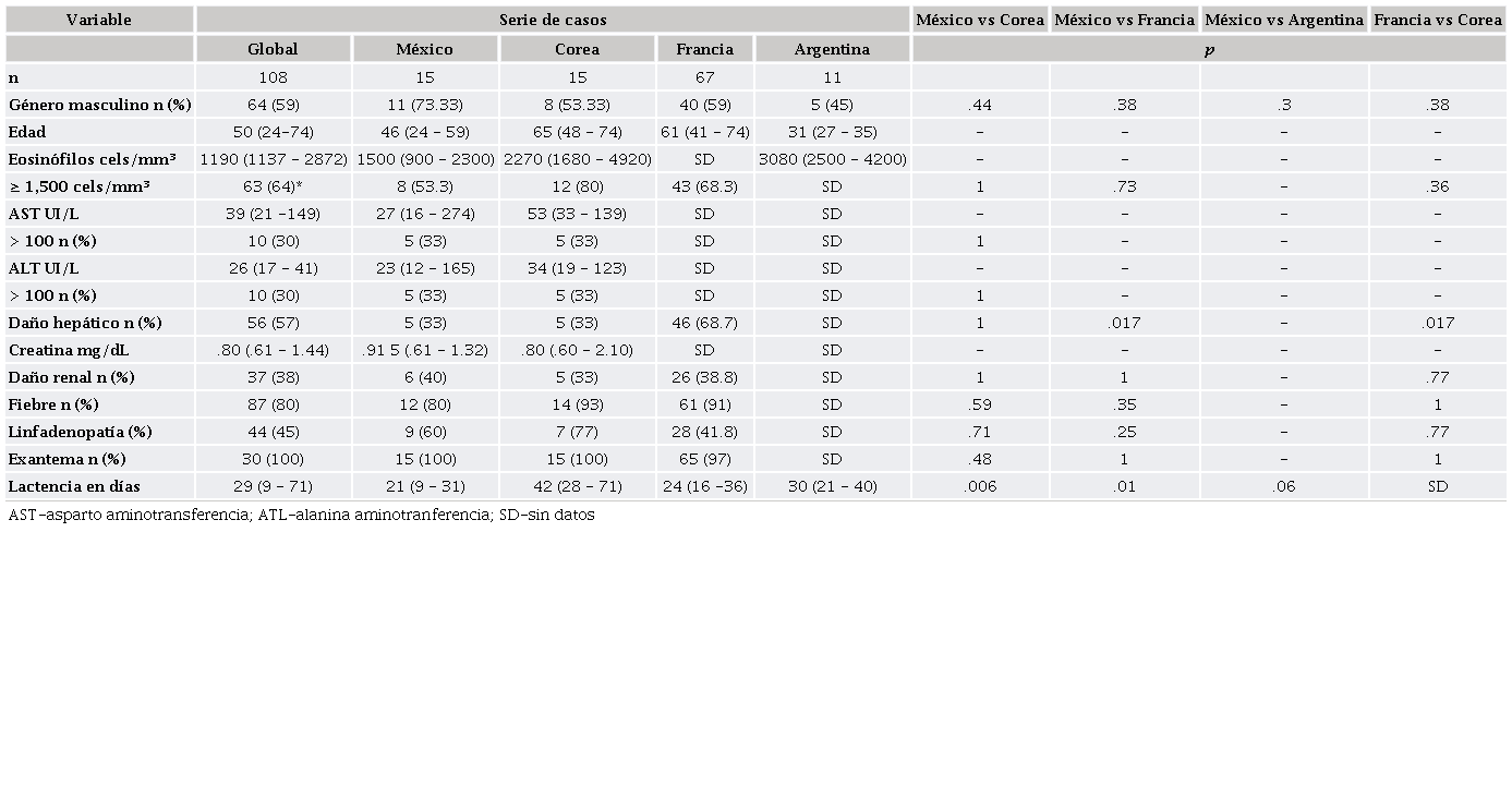 Los hallazgos clínicos y de laboratorio reportados fueron similares a los de otras series de síndrome de DRESS inducido por fármacos antituberculosos.1,5,10 Sin embargo, los pacientes mexicanos fueron más jóvenes, tuvieron concentraciones de eosinófilos más bajas y latencia más corta comparados con sujetos de series de Corea y Argentina (Figura 2, Cuadro 2). Este patrón clínico y de laboratorio del síndrome de DRESS inducido por fármacos antituberculosos es diferente al reportado en la bibliografía respecto de otros medicamentos asociados con el síndrome. Por ejemplo, los recuentos elevados de eosinófilos no es tuvieron en proporción similar a los reportados con alopurinol (<62%), fármacos antiepilépticos (<72%) o abacavir (9%), y el deterioro hepático y renal fueron menores a los descritos con carbamazepina (100%) y alopurinol (91%).11,12