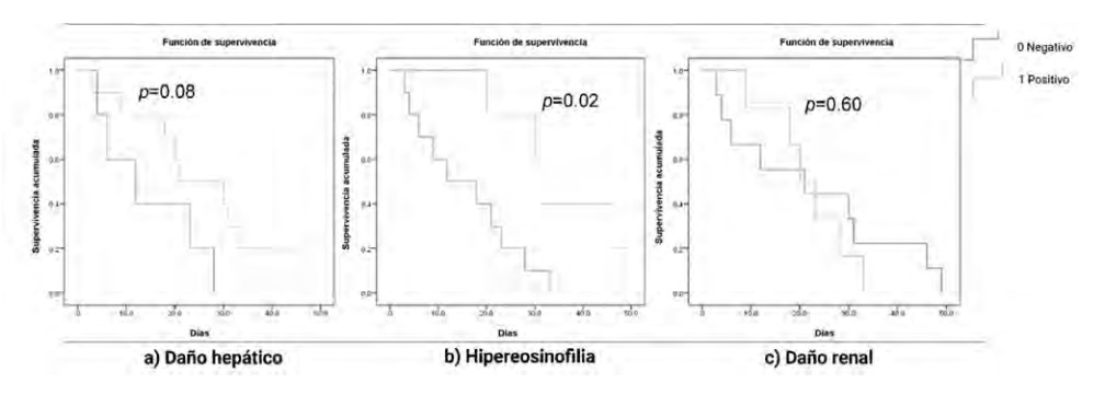 La curva de supervivencia informó que el 50% de los pacientes manifestaron síndrome de DRESS a los 21 días (4-31 días; Figura 2). La transaminasemia se asoció con latencia prolongada (p = 0.02); no obstante, los recuentos elevados de eosinófilos mostraron significación estadística (Figura 3). No hubo correlación ni asociación entre las variables cuantitativas ni cualitativas de RegiSCAR (p > 0.05).