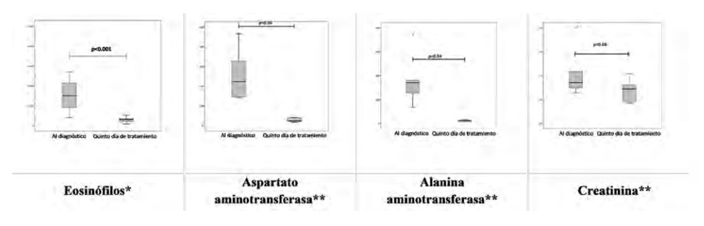 Después de cinco días de tratamiento con corticosteroides sistémicos (prednisona 50 mg), la concentración total de eosinófilos disminuyó cinco veces, de 1500 a 300 cels/mm³ (p < 0.001). De igual forma, en los pacientes que tuvieron daño a órgano blanco (hepático o renal), los valores de AST, ALT y creatinina disminuyeron significativamente (p = 0.04, para cada uno; Figura 4). Durante el período de tratamiento fueron desapareciendo la fiebre, la linfadenopatía y las manifestaciones cutáneas. Los biomarcadores implicados en la puntuación RegiSCAR se mantuvieron dentro de l o s límites de referencia 28 días posteriores a la finalización del tratamiento (p > 0.05). No se reportaron defunciones por síndrome de DRESS ni complicaciones inherentes a la suspensión de los antifímicos, como la hemoptisis.