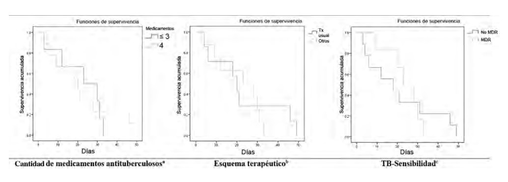 La mayoría de los pacientes diagnosticados con síndrome de DRESS recibían al menos dos medicamentos, 8 de 15 (53.3%) fueron tratados con el régimen DoTBal (rifampicina, isoniazida, pirazinamida, etambutol, SILANES, México); específicamente, 11 de 15 (73.3%) recibía etambutol, 10 de 15 (66.6%) isoniazida, 9 de 15 (60%) pirazinamida, 8 de 15 (53%) de rifampicina, 3 de 15 (20%) capreomicina y 2 de 15 (13.3%) moxifloxacina. Además, se encontró que 8 de 15 (53.3%) tenían Mycobacterium tuberculosis sin patrón de resistencia. No encontramos asociación estadística entre la latencia de DRESS y el esquema terapéutico, la catidad de medicamentos antituberculosos ni el patrón de resistencia (p > 0.05; Figura 5).