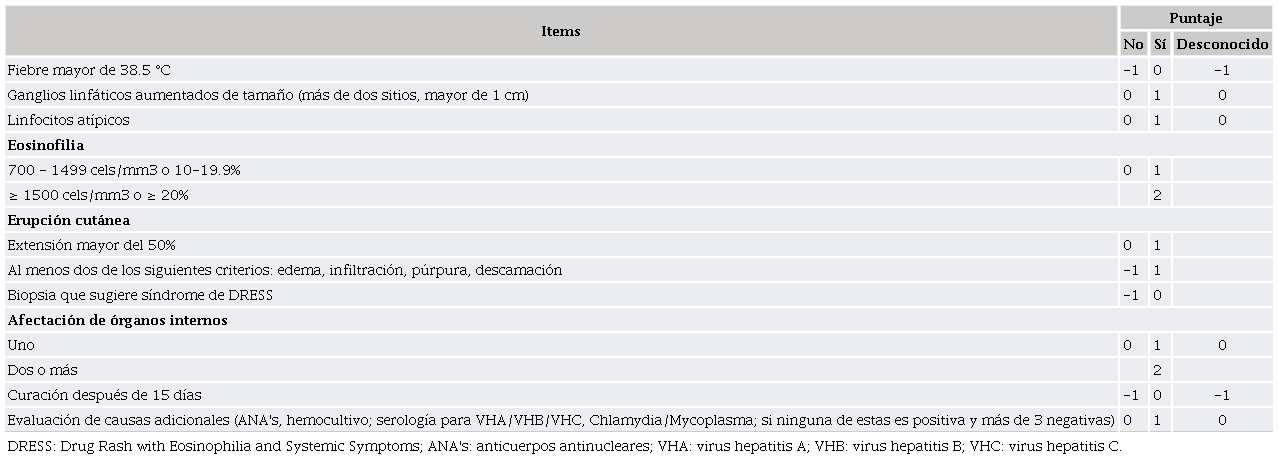 La puntuación RegiSCAR se aplicó para todos los casos (Cuadro 1).7 Se definió “posible caso” de DRESS si el paciente tuvo una puntuación de 2-3, “probable caso” cuando tuvo una puntuación de 4-5 y “caso confirmado” si el paciente reportó una puntuación mayor de 5. El tratamiento se estableció en consenso con el grupo médico adscrito al Departamento de Inmunogenética y Alergia del INER, de acuerdo con las recomendaciones de la American Academy of Dermatology (AAD) publicadas en 2013.8