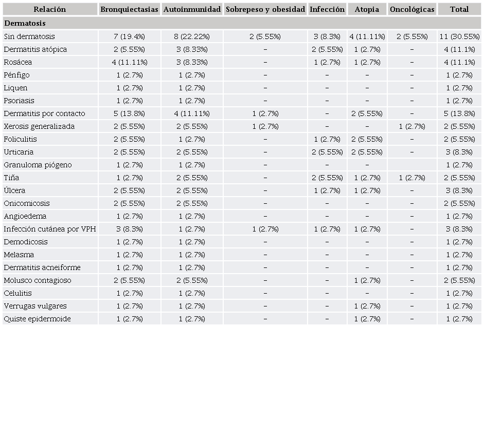 Respecto a la relación o no de dermatosis y pacientes con autoinmunidad, la prueba de c2 resultó con 0.296, bronquiectasias 0.629, obesidad y sobrepeso 0.371, infección 0.899, atopia 0.983 y oncológicos 0.913, sin asociación real entre estas variables.