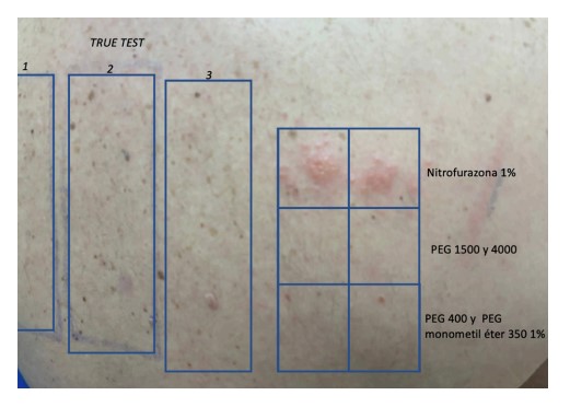Paciente masculino de 48 años, con antecedentes médicos de obesidad, dislipemia e infarto inferior en 2009; colocación de un stent, en tratamiento con hipolipemiantes, antiagregantes y anticoagulantes por vía oral. Acudió a consulta médica por un cuadro de lesiones ampollosas, con exudado seroso luego de dos días de haberse aplicado nitrofurazona en una lesión del miembro superior y en una fístula anal. Las lesiones perduraron dos semanas, con hiperpigmentación residual que continuó durante un mes. Ocho semanas después de finalizar el tratamiento y luego de desaparecer las lesiones residuales se llevaron a cabo pruebas epicutáneas con la batería estándar (True test/ Marti tor. Cervelló, Barcelona, España), y puesto que Furacin® contiene nitrofurazona al 0.2% y polietilenglicol como vehículo, se decidió comprobar sus componentes por separado, solicitando al servicio de Farmacología los siguientes reactivos: nitrofurantoina al 1% en vaselina, polietilenglicol 1500 y 4000 al 1% en vaselina, polietilenglicol 400 puro y polietilenglicol monometil éter 350 al 1% en agua. Se aplicaron los diferentes componentes en apósitos para pruebas epicutáneas (Curatest- Marti tor. Cervelló, Barcelona, España) y se fijaron en la piel sana, en la espalda del paciente. Luego de realizar las lecturas (48 y 96 horas después) se obtuvo un resultado positivo solo para nitrofurantoina 1% en vaselina (++, con eritema, infiltración y vesículas). Figura 1