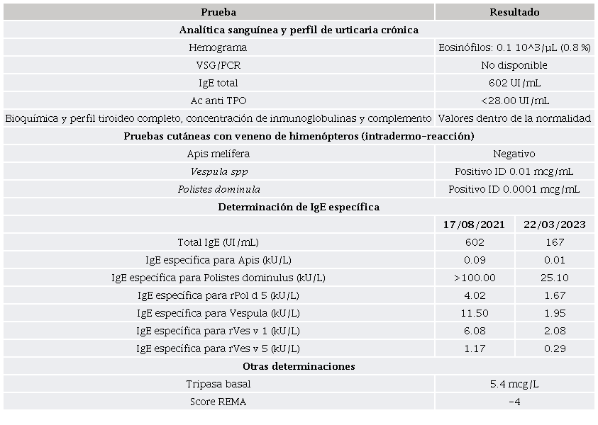 Paciente femenina de 56 años, dedicada a la jardinería, sin antecedentes médicos ni tratamiento farmacológico habitual. La paciente tenía alta exposición a picaduras de avispa (por su oficio) y había sufrido previamente reacciones locales extensas sin síntomas sistémicos. En julio de 2021 sufrió una picadura de avispa en el brazo y otra en el labio, posiblemente de Polistes dominula, porque identificó los nidos característicos de esta especie. Al cabo de una hora de la picadura manifestó prurito palmoplantar y lesiones habonosas, pruriginosas, generalizadas y evanescentes, sin afectación respiratoria ni cardiovascular, por lo que precisó asistencia en el servicio de Urgencias y tratamiento con dexclorferamina y metilprednisolona por vía oral para su curación. Se estableció el diagnóstico de “reacción alérgica por picadura de avispa” y se indicó tratamiento domiciliario con metilprednisolona y loratadina durante 7 días. Al finalizar el tratamiento reaparecieron los habones generalizados evanescentes a diario y angioedema facial ocasional. La paciente no asoció las lesiones con los alimentos, medicamentos ni factores físicos. Requirió varios ciclos de antihistamínicos y corticosteroides por vía oral, debido al mal control de la urticaria, hasta que fue valorada en el servicio de Alergología, donde le prescribieron ebastina 40 mg/día, con control progresivo de las lesiones por urticaria que persistieron durante 12 semanas. Finalmente pudo retirarse progresivamente el antihistamínico sin recurrencia del cuadro.