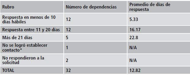 Independientemente de la calidad de las respuestas, las instituciones (las que respondieron) que menos tiempo tardaron en responder fueron la Unidad de Transparencia de Quintana Roo y la Procuraduría General Justicia del Estado de Sinaloa y San Luis Potosí (1 día). En contraste, la Unidad de Transparencia de Colima fue la dependencia que más demoró en hacerlo (27 días). En promedio, las instancias estatales que respondieron a nuestra solicitud rebasaron el periodo de diez días de respuesta (12.82 días). Por tanto, si el límite máximo de atención para todas las dependencias estatales fuese de 10 días, 53.12% lo hubieran hecho fuera de tiempo.
