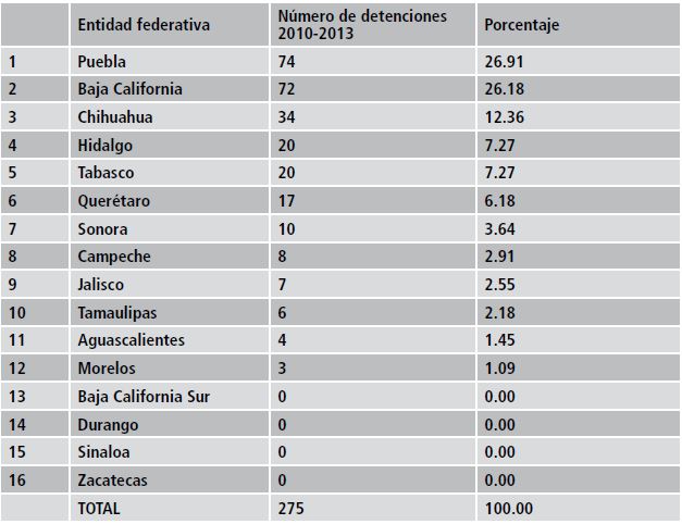 Entre 2010 y 2013, según los datos que arrojan las respuestas a las solicitudes de información presentadas, se cuenta con un registro de 275 detenciones por la presunta comisión del delito de trata de personas. Dichas detenciones se han realizado en 16 entidades federativas. Las 16 restantes que fueron contempladas para el presente estudio no proporcionaron información sobre este punto o no respondieron a nuestra solicitud o no logramos presentar la solicitud.