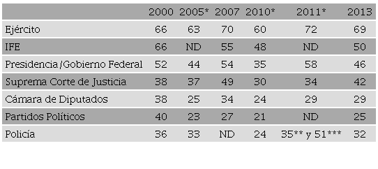 De acuerdo con encuestas levantadas por el diario Reforma, en septiembre del 2000, un par de meses antes de la transición de partido en los poderes presidenciales, el Ejército encabezaba la confianza de los mexicanos con 66 puntos porcentuales, empatado en el primer lugar con el Instituto Federal Electoral (IFE), institución que vivía en aquel año una época de gloriosa aceptación, tanto a nivel de la clase política y académicos como en sectores más amplios de la opinión pública. Trece años después, Reforma publicó los resultados de la misma encuesta en levantamientos para 2007 y 2013: el IFE ha desplomado parte de esa aceptación y en el fondo siguen los partidos políticos y policías, pero las Fuerzas Armadas permanecen con altos grados de confianza y aceptación, tal como se muestra a continuación: