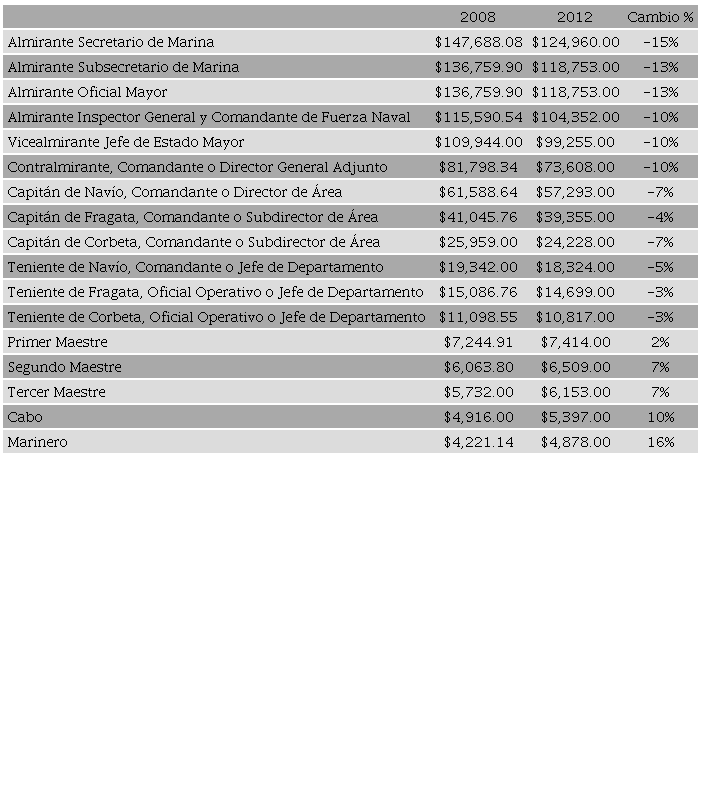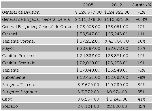 Con datos del Atlas de la Seguridad y la Defensa de México 2009 y la versión del 2012, se presentan a continuación las variaciones en los ingresos mensuales de los miembros de la Secretaria de Marina y la Secretaria de la Defensa Nacional: