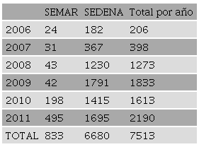 Que las Fuerzas Armadas Mexicanas estuvieran sobreexpuestas a la población civil durante el sexenio de Felipe Calderón generó, naturalmente, una mayor interacción y, adversamente, un aumento en la violación a los derechos humanos. Según cifras de México Unido Contra la Delincuencia, las Fuerzas Armadas acumularon 7 513 quejas por supuestas violaciones a los derechos humanos, cifra que representa el 15% de un total de 49 873 quejas presentadas hasta el 2011. La SEDENA acumuló más quejas que la SEMAR y, como se observa en la siguiente tabla, a partir del 2008 las quejas crecieron en más de un 200%. Fue en el 2011 cuando la Secretaría de Marina acumuló más quejas, sin rebasar nunca las cifras alcanzadas por la SEDENA.