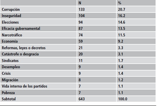 1. Economía, 2. Inseguridad, 3. Narcotráfico, 4. Crisis, 5. Reformas, Leyes o Decretos, 6. Partidos políticos, 7. Eficacia gubernamental, 8. Migración, 9. Pobreza, 10. Corrupción, 11. Elecciones, 12. Sindicatos, 13. Catástrofes, 14. Desempleo.
