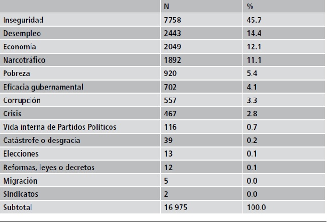 Lo que esta tabla nos indica es que la mayoría de mexicanos observaba los problemas relativos a la seguridad (categorías "Inseguridad" y "Narcotráfico") como los principales que enfrentaba el país, por encima de los económicos (categorías "Economía", "Desempleo", "Crisis").