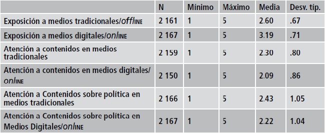 Atención a contenidos: Se refiere a la selección, en algunos aspectos, de la percepción sobre política. Se midió con una escala Likert de 5 puntos, que oscilaba entre nada (1) y bastante (5). La consistencia interna de la escala fue (α=.75)
