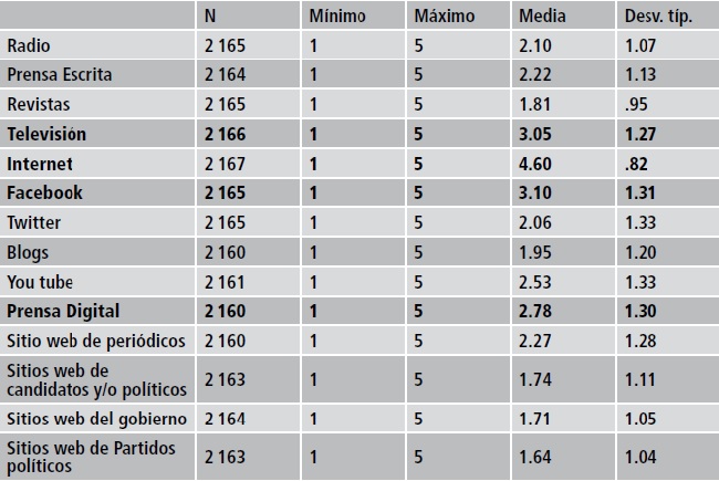 Asimismo, se evaluaron los medios de comunicación en que los jóvenes más buscan información y noticias (ver tabla 3). Se observa un mayor consumo (M>3) de internet (M = 4.60, DE = .824), Facebook (M = 3.10, DE = 1.320) y televisión (M = 3.05, DE = 1.256). Lo indudable es que los más jóvenes cada vez se alejan más de la televisión, la radio y la prensa en favor de internet, las redes sociales y la prensa digital. Por otra parte, los sitios web oficiales de los políticos, partidos políticos y/o gobiernos, son medios que visitan muy poco los jóvenes.