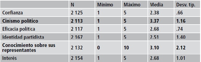 Cinismo político: Es la percepción de los ciudadanos acerca de la motivación positiva o negativa en la conducta de los actores políticos. En la parte positiva, los motivos privados coinciden con lo que públicamente opinan los actores políticos, y la parte negativa se refiere a la percepción de que los motivos privados difieren de su motivación pública, en la que su interés sería beneficiarse en términos materiales o simbólicos.36 Se midió con una escala Likert de 5 puntos, que oscilaba entre nada (1) y bastante (5). La consistencia interna de la escala fue (α=.85)