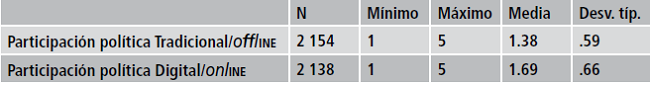 Frente a este contexto, el resultado de la acción política de los jóvenes fue muy bajo (M<3). Esto se observa en el nivel de participación tanto tradicional como digital (Ver tabla 5). No obstante, fue mayor la participación en línea. En ese sentido, aunque los jóvenes se hallan expuestos de forma importante a contenidos sobre política en los diferentes medios, por las mismas razones resulta un reto la movilización política para cualquier candidato o partido político. Actualmente, en el proceso electoral, existe una gran cantidad de información sobre los candidatos, tanto en medios tradicionales como digitales. Pese a lo anterior, la relación interpersonal sigue siendo un factor esencial en el accionar político de los jóvenes, así como en la toma de decisiones.
