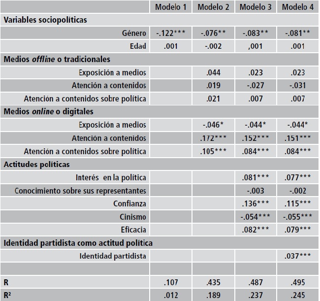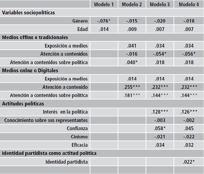 El primer modelo (ver tabla 7) explica .6% de la varianza (R2=.006), debido a que sólo la variable género del encuestado fue significativa (β= -.076, p< .001). Posteriormente, al incorporar las variables de consumo de medios de comunicación en el dodelo 2, se incrementó a 34% de la varianza (R2=.338), debido en mayor medida al nivel de atención de contenidos que tienen los jóvenes en los medios digitales (β= .255, p< .001) y a la búsqueda de información sobre política (β= .181 p< .001). Después se incorporaron en el modelo 3 las variables independientes de las actitudes políticas, las cuales contribuyeron a incrementar en 37% la varianza explicada (R2=.369), donde la atención a contenidos sigue siendo un factor explicativo importante, ya sea en medios tradicionales como digitales. Se agregó el interés (β= .128, p< .001) y, en menor medida, la confianza (β= .058, p< .05). Por último, en el modelo 4 se incorporó la variable identidad partidista (β= .022, p< .05), que se considera como una actitud política. Al incorporarla, la varianza fue muy similar al modelo anterior, con 37% (R2=.371).