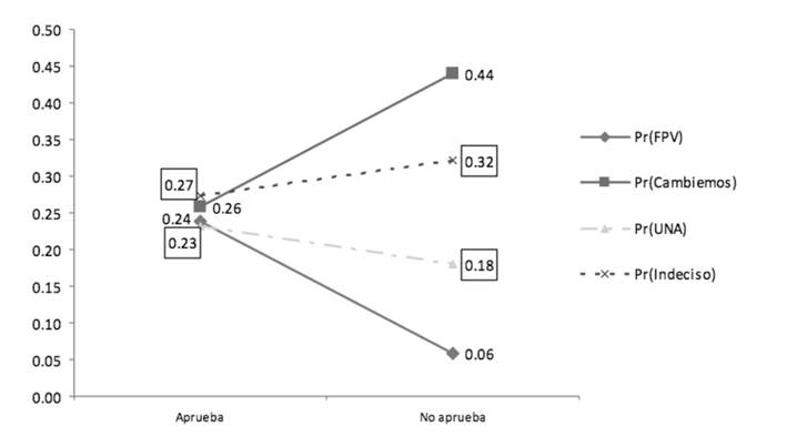 La figura 1 muestra que, efectivamente, entre quienes no aprueban la gestión de la Presidenta, la probabilidad de votar por Cambiemos aumenta significativamente (de .26 a .44), y la probabilidad de votar por el FPV disminuye de .24 a .06. Algo similar pero menos marcado ocurría entre los "indecisos", hecho que puede explicar en alguna medida el aumento del caudal de votos de Macri en las elecciones del 25O. De manera interesante, el comportamiento de los electores cercanos a UNA se parece más al del FPV, ya que su probabilidad de votar por este espacio aumenta cuando aprueban la gestión gubernamental y no cuando disminuye.