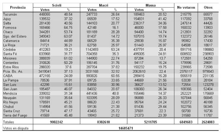El ejercicio es, por tanto, sencillo. Se toman en cuenta dos elementos: a) la cantidad de votos en disputa (ya sea que consideremos sólo los de Massa, ya que sumemos los de todos los candidatos diferentes a quienes compiten en el ballotage, o que sumemos a éstos los de aquellos electores que no acudieron a las urnas del 28 de octubre); b) la razón de votos que caracteriza la votación de los dos candidatos (Scioli y Macri) en cada una de las provincias.33