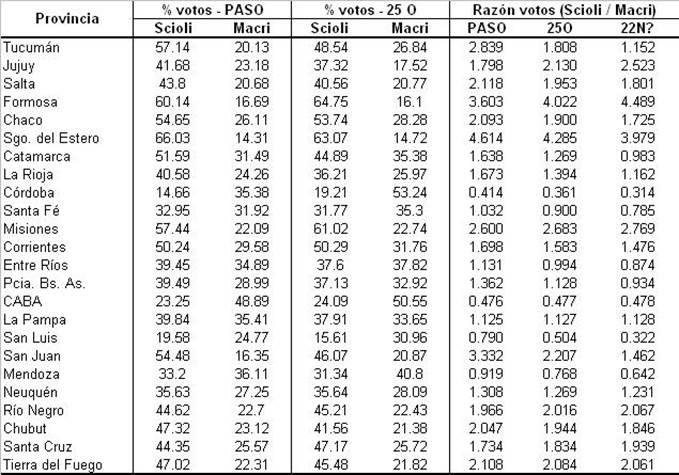Si continúa la tendencia a favor del candidato de Cambiemos, Mauricio Macri, observada entre las PASO y las elecciones de primera vuelta, la razón de votos entre ambos continuará reduciéndose en aquellas provincias donde Scioli fue ganador, y ampliándose (a favor de Macri) en las que haya triunfado el candidato opositor. Si tomamos como ejemplo el caso de Tucumán, donde los votos de Scioli en las PASO representaron 2.8 veces los votos de Macri, pero dicha razón disminuyó a 1.8 veces en la elección de octubre, la continuación de la tendencia llevaría a que la diferencia fuese de solo 1.15 -a favor de Scioli- en el ballotage.