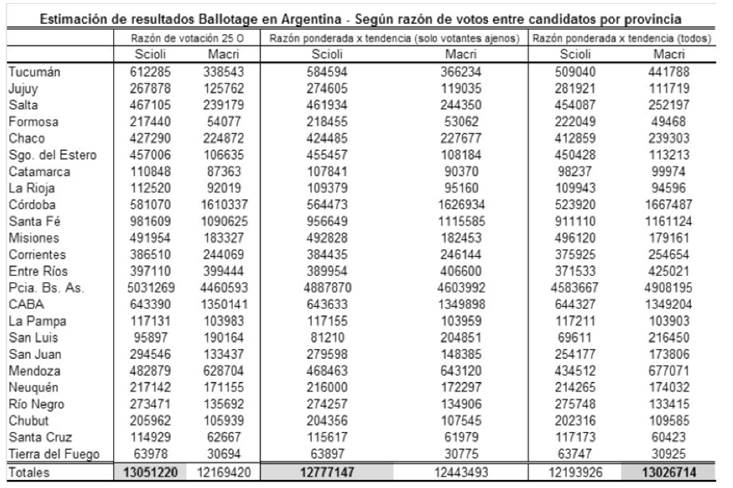 De acuerdo con estas tres estimaciones, basadas en datos duros (electorales), los resultados de la tabla 4 muestran que Scioli hubiera quedado ganador en dos, y Macri en la restante. De mantenerse "la razón de votos por provincia de la primera vuelta para todos los votantes" (propios y ajenos) (estimación más conservadora), así como en el caso de que la nueva razón (que recoge la tendencia ya divisada entre las PASO y la "primera vuelta") se hubiera aplicado sólo a los votantes de otros partidos, el candidato del Frente para la Victoria hubiera sido el triunfador, si bien por un pequeñísimo margen en este segundo caso (50.66% contra 49.34% de Macri).