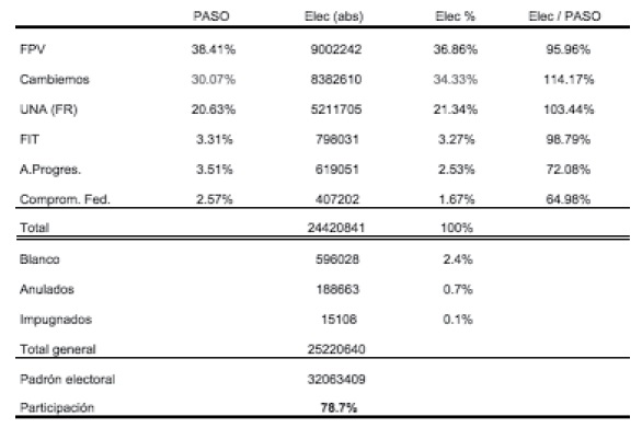 Entre agosto y octubre de 2015 (es decir, entre las PASO y las elecciones generales), la Alianza Cambiemos fue la única fuerza política que aumentó significativamente su proporción de votos sobre el total. Aumentó 14% su caudal electoral, mientras que Scioli, el candidato oficialista (pese a obtener más votos) cayó 1.55 puntos porcentuales, que representan 96% del voto obtenido por el FPV en las PASO.