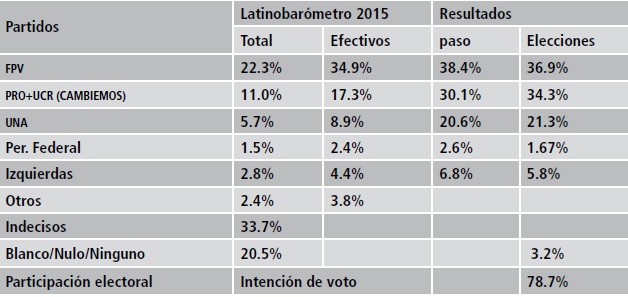 Para probar la efectividad de las encuestas en la predicción relativa de los resultados de las elecciones de Argentina, se utilizó como fuente de información el estudio de Latinobarómetro 2015, aplicado a principios del año en cuestión. Esto último aumenta el margen de error, ya que la distancia entre el momento de levantamiento de los datos de la encuesta y las elecciones es de más de seis meses; por tanto, es imposible captar los efectos propios de la campaña electoral. De cualquier modo, los datos del Latinobarómetro representaron una fuente efectiva para predecir los resultados de las elecciones argentinas, no sólo para la primera vuelta, sino fundamentalmente para el ballotage.