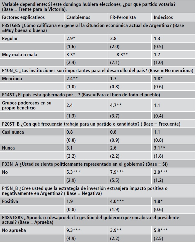 La tabla 7 presenta los resultados del modelo econométrico (logístico multinomial) diseñado para construir los perfiles de los votantes "modales" (más representativos) del Frente para la Victoria (Scioli), Cambiemos (Macri), UNA (Massa) e Indecisos.39