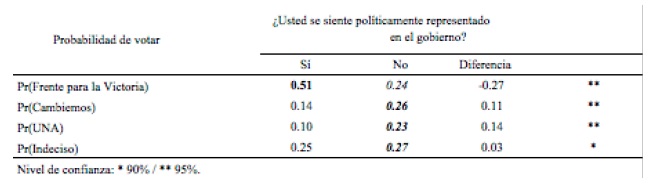 Los resultados de la tabla 8 son un poco más contundentes. Aquí los votantes opositores se parecen más; ya la probabilidad de votar por Cambiemos o por el espacio una-Peronismo Federal aumenta significativamente entre quienes dicen no sentirse representados por el gobierno.